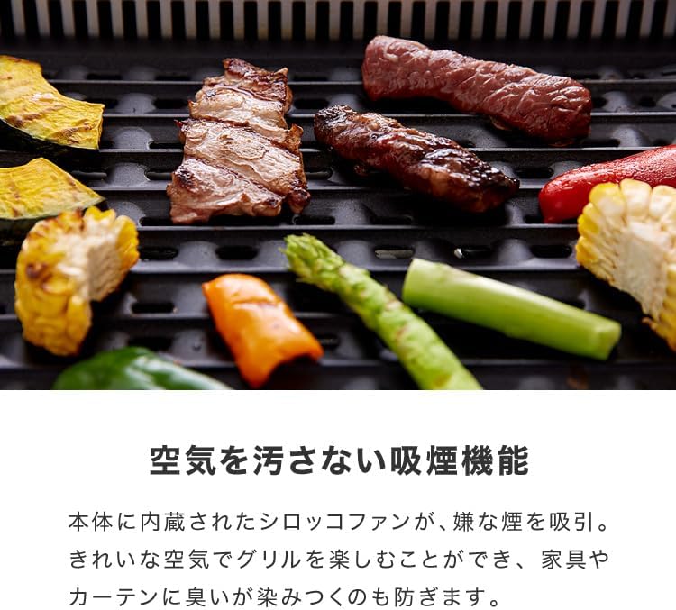 「焼肉後の部屋のニオイが、以前使っていたホットプレートとは比べ物にならないくらい少ないです。服やカーテンへのニオイ移りを心配しなくていいのが最高です。」