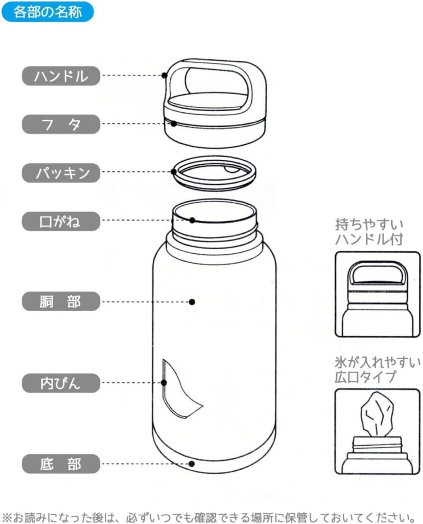 - 素材・材質:内びん・口がね・低部=ステンレス鋼、胴部=ステンレス鋼(アクリル樹脂塗装)、パッキン=シリコーンゴム