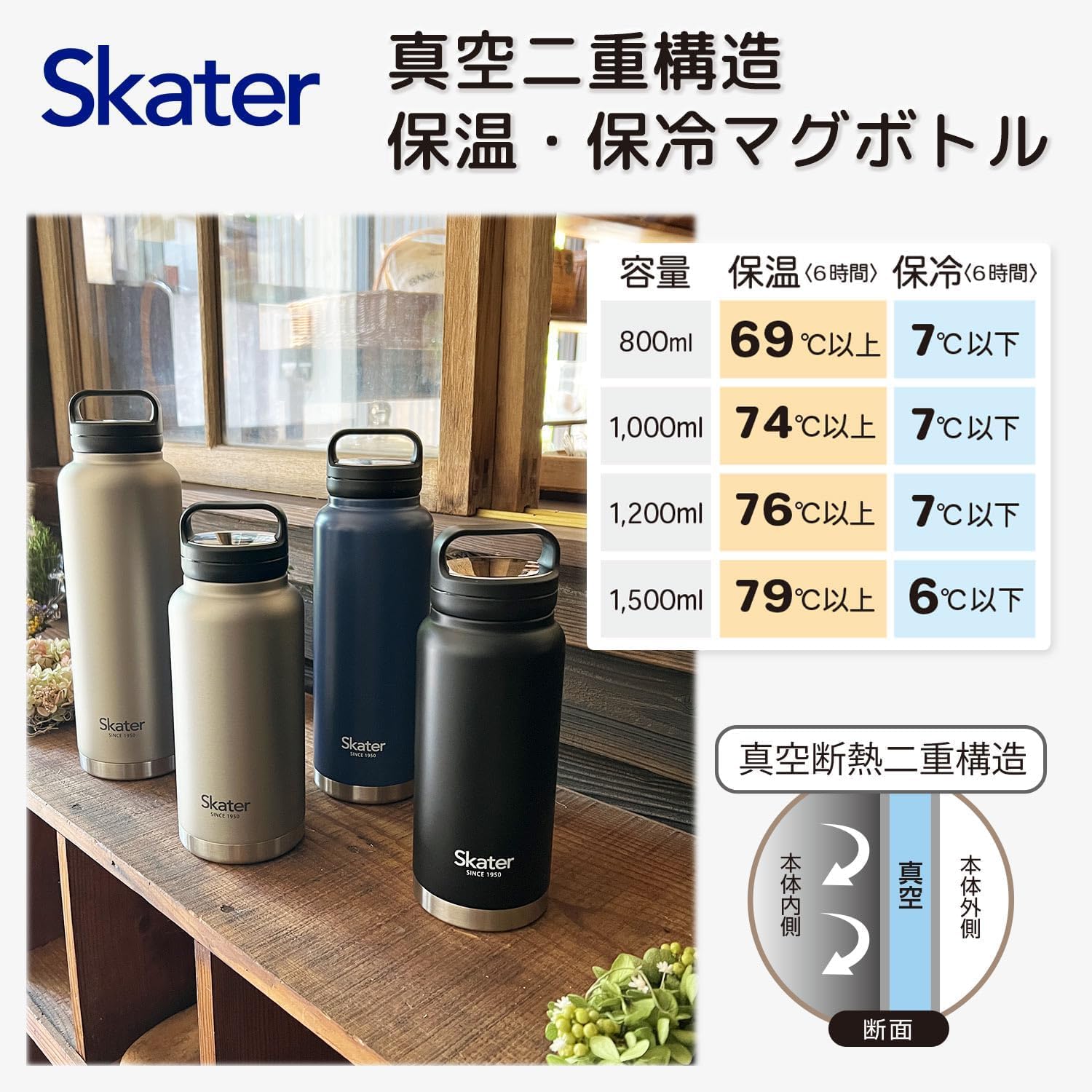 老舗ブランドSkaterが手がけるこの大容量水筒は、保温79度以上・保冷6度以下(6時間)という確かな性能を備え、真夏のスポーツ観戦から真冬のオフィスワークまで、あらゆるシーンで活躍してくれます。