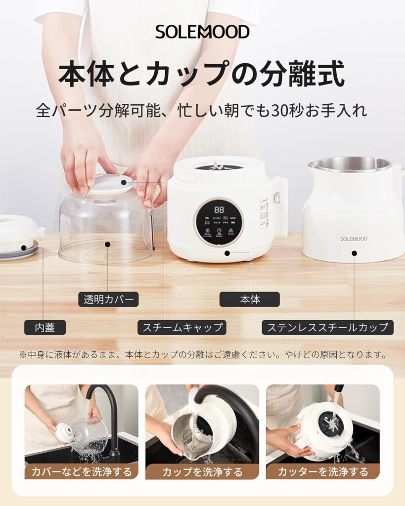 その点、SOLEMOOD豆乳メーカーは上下分離式のデザインを採用しているため、本体カップから加熱・攪拌部分を取り外して、刃まで直接水洗いができます。