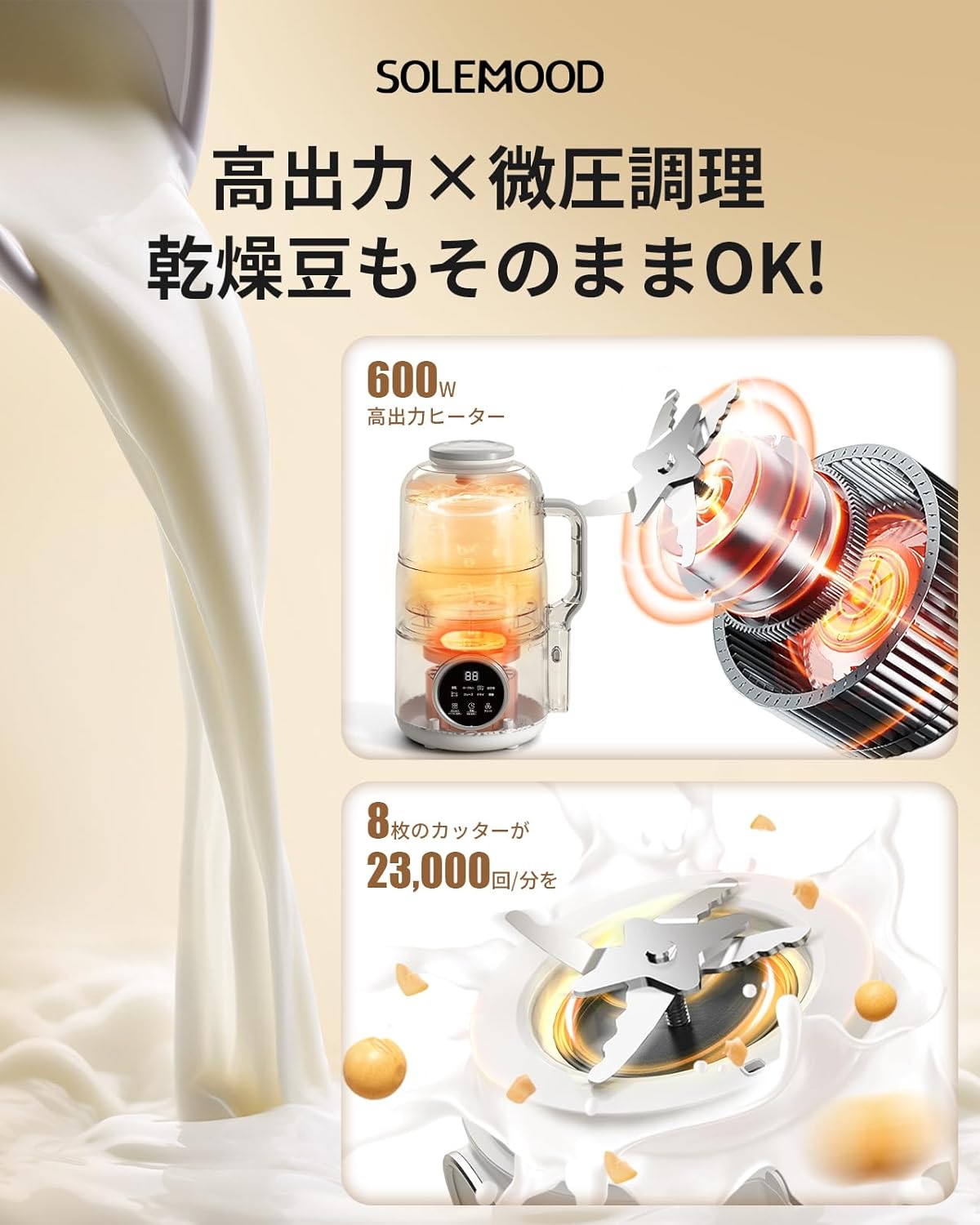 • 【一台多役・軽量】8枚刃の強力カッターで大豆を微粉化し液体化。600Wヒーターが大豆を瞬時に柔らかくし、生煮えを防止。スチームによる微沸騰で乳化プロセスを再現し、ミルクのようななめらかな豆乳に仕上がる。おかゆ/スープ/離乳食/ジューサー/スムージー/ヨーグルトなど多彩なモードを備えた自動調理ポットとしても活躍