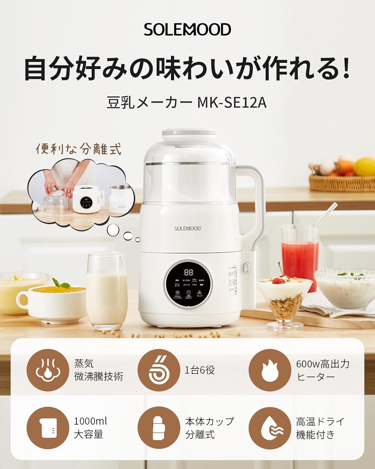 そんな今、自宅で本格的な豆乳を手軽に作れる調理家電として注目を集めているのが、SOLEMOOD豆乳メーカーMK-SE17Aです。