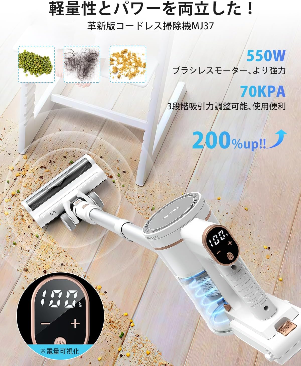 Orageの人気モデルが一般的に26,000Pa〜30,000Pa程度の吸引力を公称しているのに対し、Tailulu MJ37は「70Kpa(70,000Pa)」という、頭一つ抜けた数値を提示しています。もちろん、掃除機の清掃能力はPa(真空度)だけでなく、ヘッドのブラシ構造や気流設計にも左右されますが、スペック上のパワーを最優先するユーザーにとって、MJ37の数値は圧倒的な魅力として映ります。