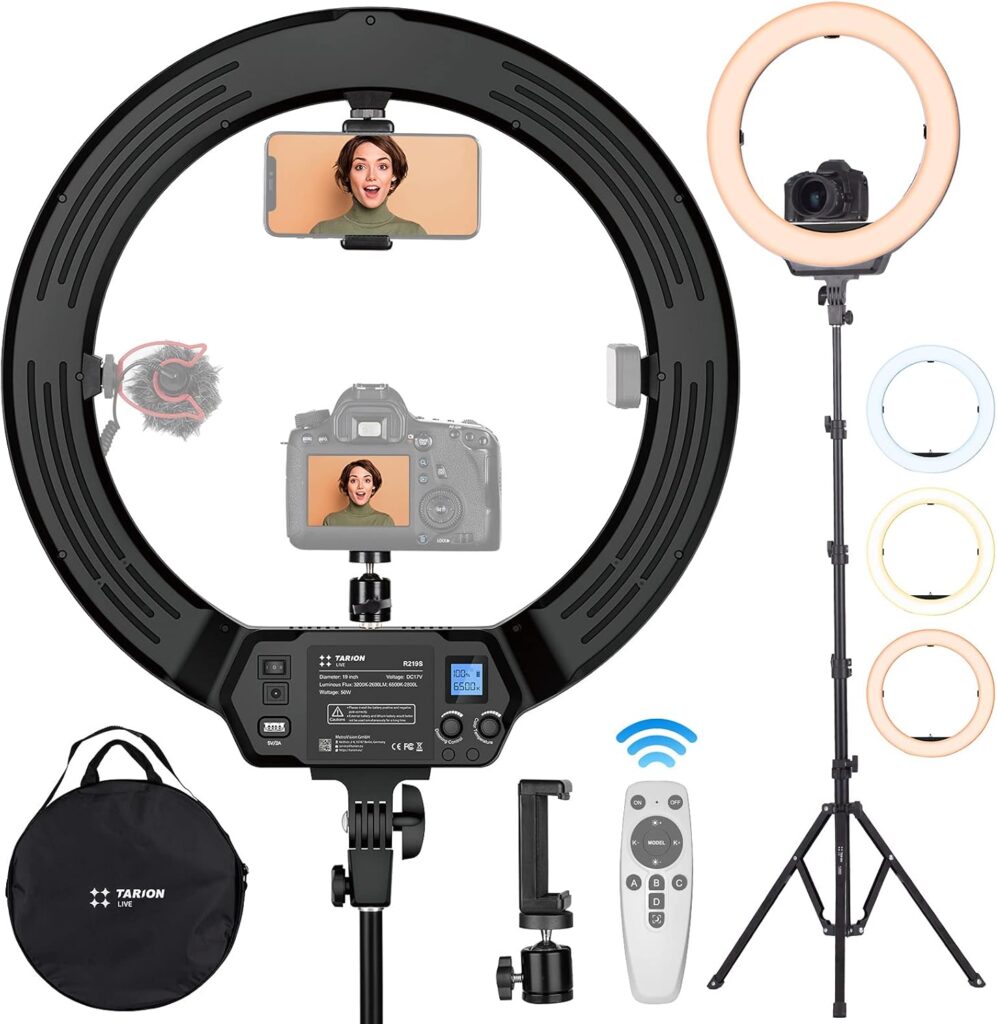 - 大型サイズと付属品の充実: TARIONの19インチリングライトは、その大きさ(直径)が特徴であり、より広い範囲を均一に照らします。さらに、スタンド、雲台、スマホクリップ、収納バッグが全てセットになっているため、購入後すぐにフルセットで運用を開始できます。