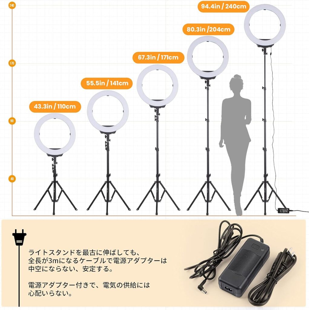 - 圧倒的な光量と美肌効果の19インチ(品質100点):リングライトの生命線であるサイズが「19インチ」というのは、顔だけでなく、肩や上半身全体まで、光を均一に届ける上で理想的です。大きなリングが発する光は、まるでプロのメイクアップアーティストが当てるソフトボックスのように、顔の凹凸による影を優しく打ち消し、瞳に天使の輪(キャッチライト)を入れます。このサイズは、配信者の表情をより豊かに、より美しく見せるための最重要ファクターです。