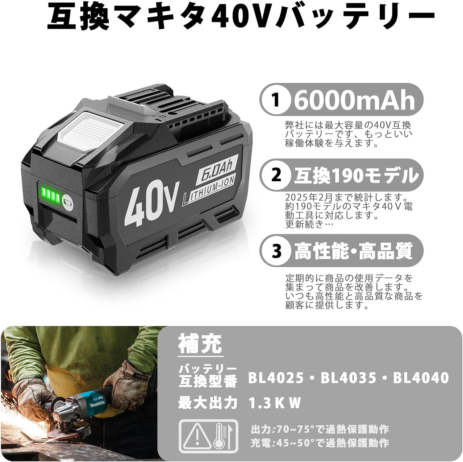 - その他 機能:マキタ40V電動工具のバッテリー交換用で、高容量6000mAh