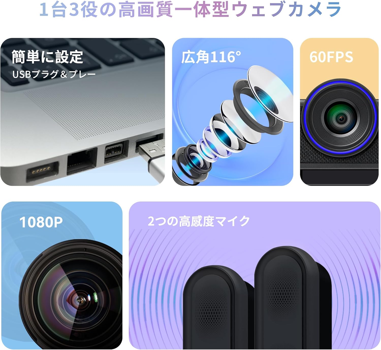 - 付属品11080PWebカメラ、1保護カバー、1Type-Cケーブル、1取扱説明書
