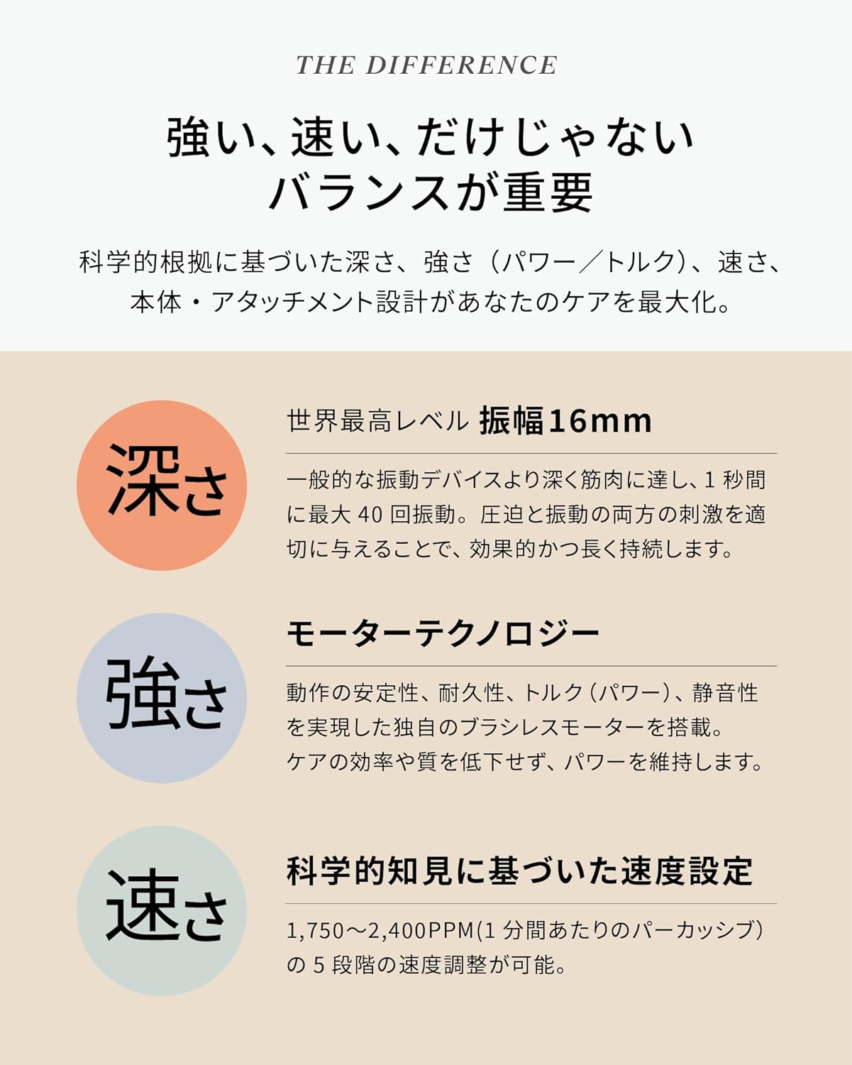 Theragun TG0004116を他メーカーの一般的な製品と比較した際、最も顕著に現れる違いは「振幅(アンプリチュード)」の深さです。市販されている安価なモデルや、美容系メーカーが販売する製品の多くは、振幅が8mmから10mm程度に設定されています。これらは主に皮膚表面の血行を促進し、リラクゼーションを与えることに長けています。
