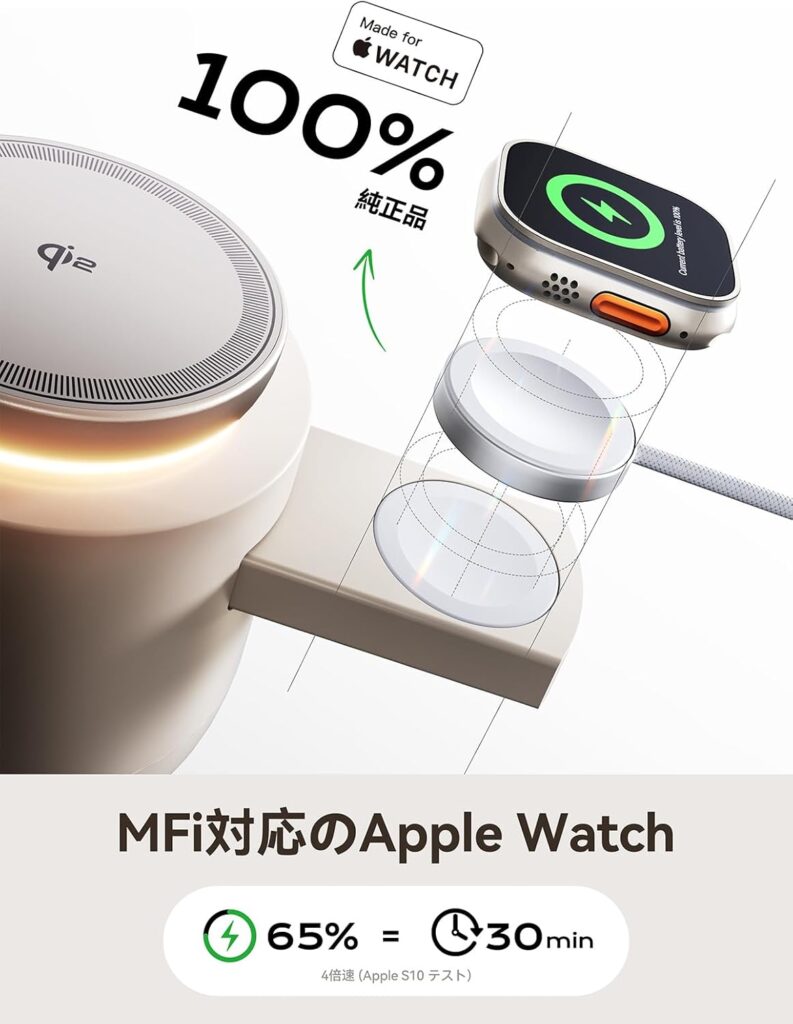 - 対応デバイス:iPhone 17シリーズ, iPhone 16/15/14/13/12シリーズ, Apple Watch Ultra 2/1, Apple Watch Series 10/9/8/7/6/5/4/3/2/1, Apple Watch SE 2/1, AirPods 4/3/2, AirPods Pro 2/1, iPad Pro 6/5/4/3, iPad Air 6/5/4, iPad 10/9/8/7/6, iPad Mini 7/6, その他すべてのQi対応デバイス