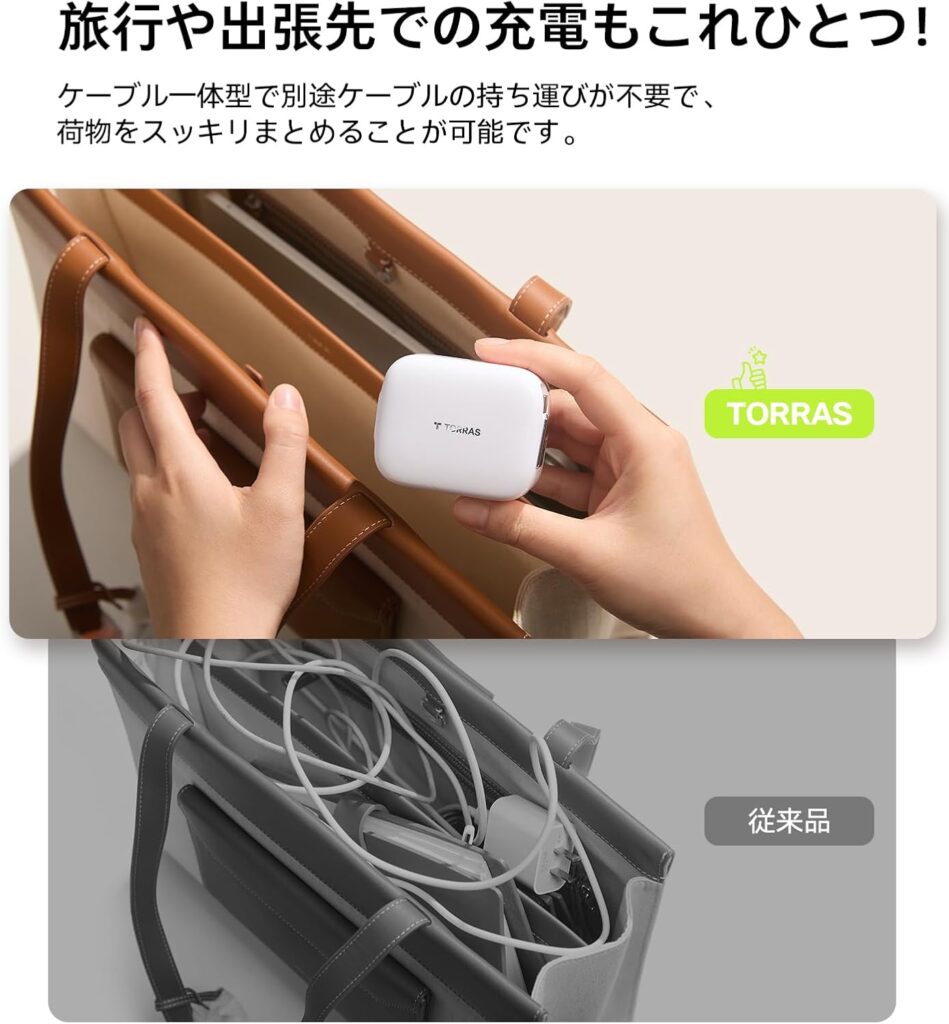TORRAS CQ4の最も際立つポジティブな特色は、その革新的な「タイプCケーブルー体型」という組立方式です。これは、充電器とケーブルを常にセットにしておくことを可能にし、「ケーブルを忘れた!」という日常的な小さな悲劇を完全に防ぐユーザーファーストな解決策を提供しています。