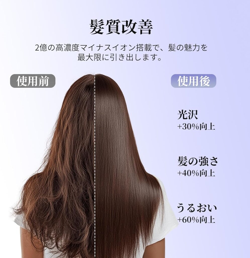 「マイナスイオンの効果か、髪がしっとりまとまるようになりました。乾かした後の手触りが明らかに変わり、ヘアオイルの使用量も減りました」