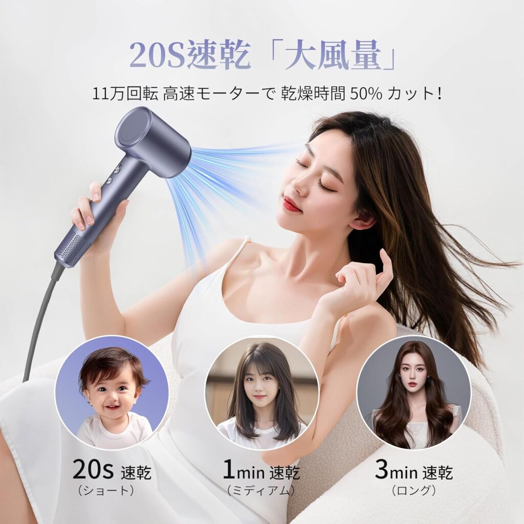 「乾くスピードが今までのドライヤーと全然違います。11万回転のモーターは伊達じゃないと実感しました。朝の忙しい時間帯でも余裕を持って準備できるようになりました」