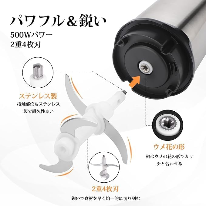 次に注目すべきは500Wという消費電力です。これはモーターの強さ、つまり食材を粉砕する力の指標となります。国内メーカーの多くは、静音性や省エネ性を重視し、150W〜300W前後のモデルが主流です。これらのモデルは野菜のみじん切りといった基本的な作業は問題なくこなせますが、硬いナッツ類や氷、冷凍フルーツ、あるいは粘りのある肉の塊などを大量に処理しようとすると、モーターに負担がかかり、仕上がりにも時間がかかることがあります。