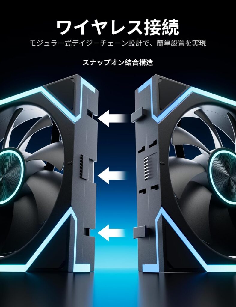 冷却性能面では、CorsairのRS120 ARGBも優れた風量を提供しますが、upHere CMUA02KC3-JPの53CFMという風量は同クラスとして十分な数値です。ただし、Corsairは静音性に特化したファンブレード設計やベアリング技術により、より洗練された動作音を実現している点で優位性があります。配線管理においては、upHereの3in1デイジーチェーン機能がCorsairの個別接続方式よりも簡素で、初心者にとって扱いやすいと言えます。