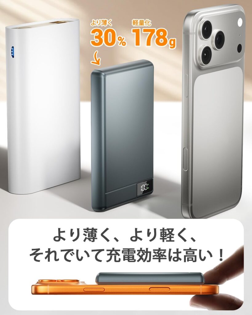 Uzantoo V13は「厚さ1.4cm、重量200g」です。対して、Ankerの定番モデル(10000mAhクラス)は、重量が約180g前後とV13より20gほど軽量な傾向にありますが、厚みは2cmを超えるものが多く存在します。また、CIOの製品は「世界最小級」を謳うモデルが多く、重量が175g前後、サイズもクレジットカード並みに小さいものがありますが、その分厚みが出る(2.5cm程度)傾向にあります。
