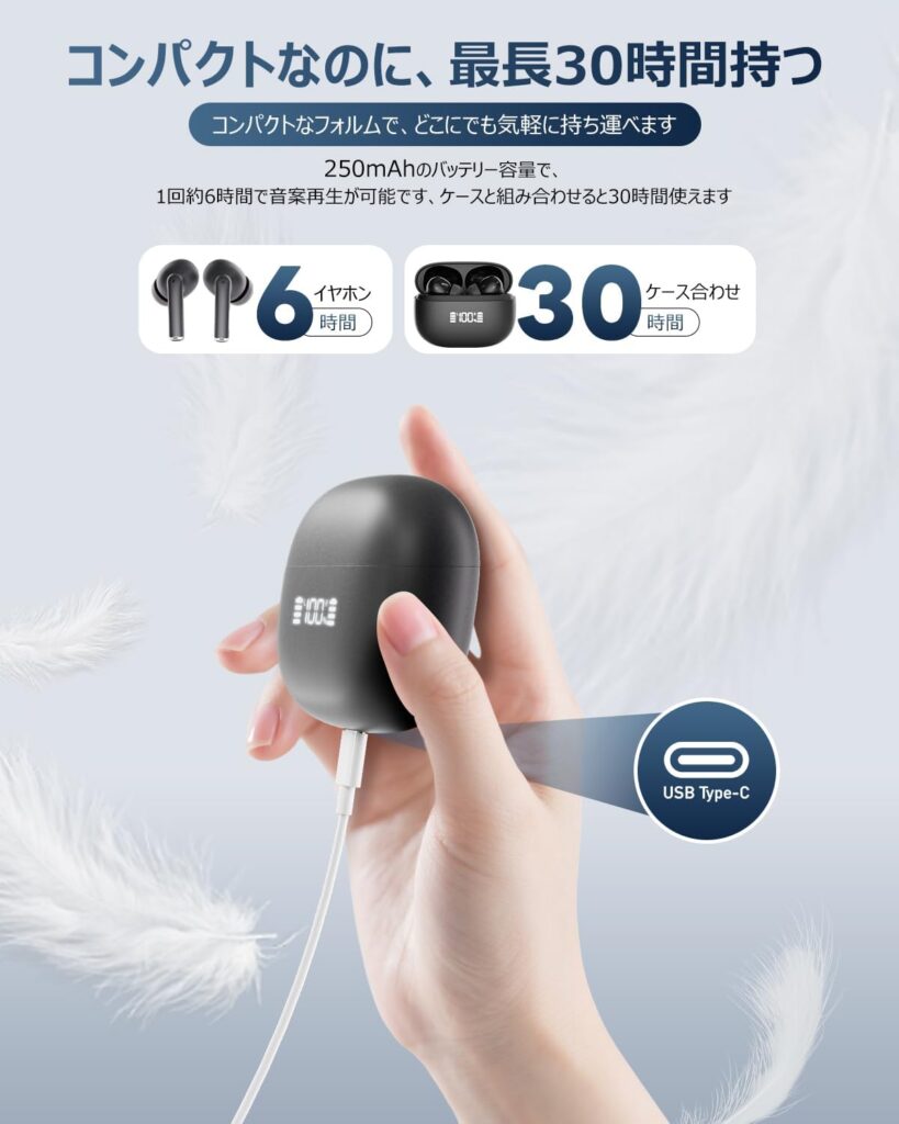 E09は、スペック上では連続再生時間が5〜6時間程度と、B社製品より控えめに見えます。しかし、特筆すべきは接続安定性の高さです。VANBOKEEは、最新のBluetooth規格に迅速に対応し、安定性を追求したチップを採用しているため、駅のホームや人通りの多い交差点など、電波の「渋滞」が発生しやすい場所でも、比較的途切れにくいという実用的な強みを持っています。バッテリー持続時間が多少短くても、充電ケースが非常にコンパクトで持ち運びやすいため、頻繁な充電も苦になりにくいという設計思想でカバーしています。「途切れることなく聴き続けられる」という実用的な快適性は、数値だけでは測れないE09の大きなアドバンテージです。