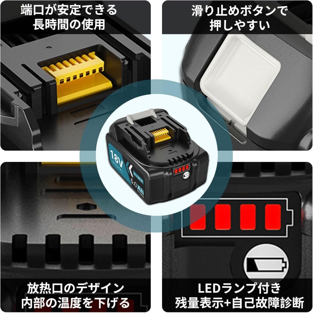 「独立した検証チャンネルの動画を見ると、実容量が公称の6.0Ahより少なかったという報告があります。重作業で長時間使うと純正品との差を体感できる気がします。」