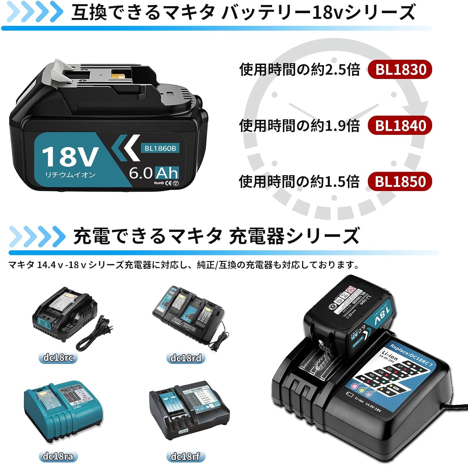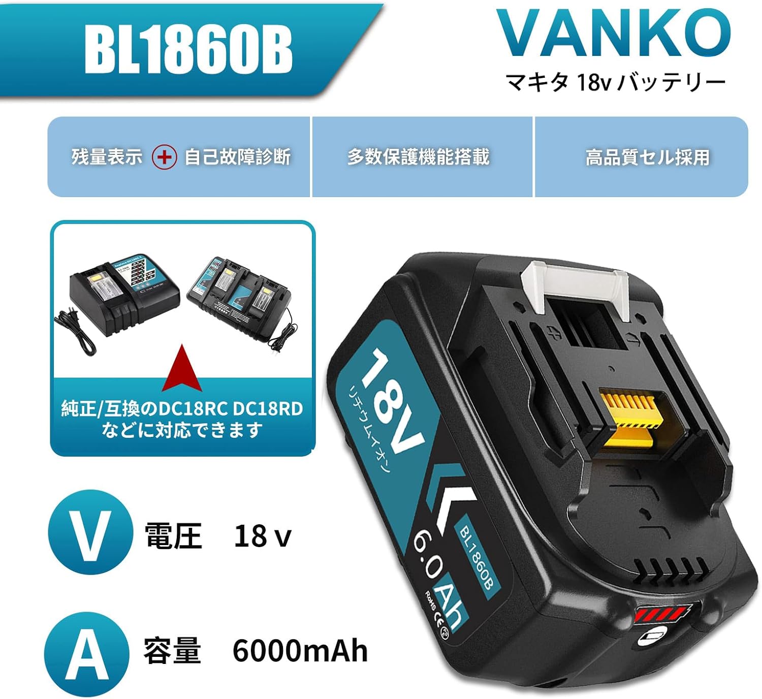 ・対応充電器:DC18RA・DC18RC・DC18RD・DC18SD・DC18RF(VANKO製DC18RC・DC18RD・DC18RFにも対応)