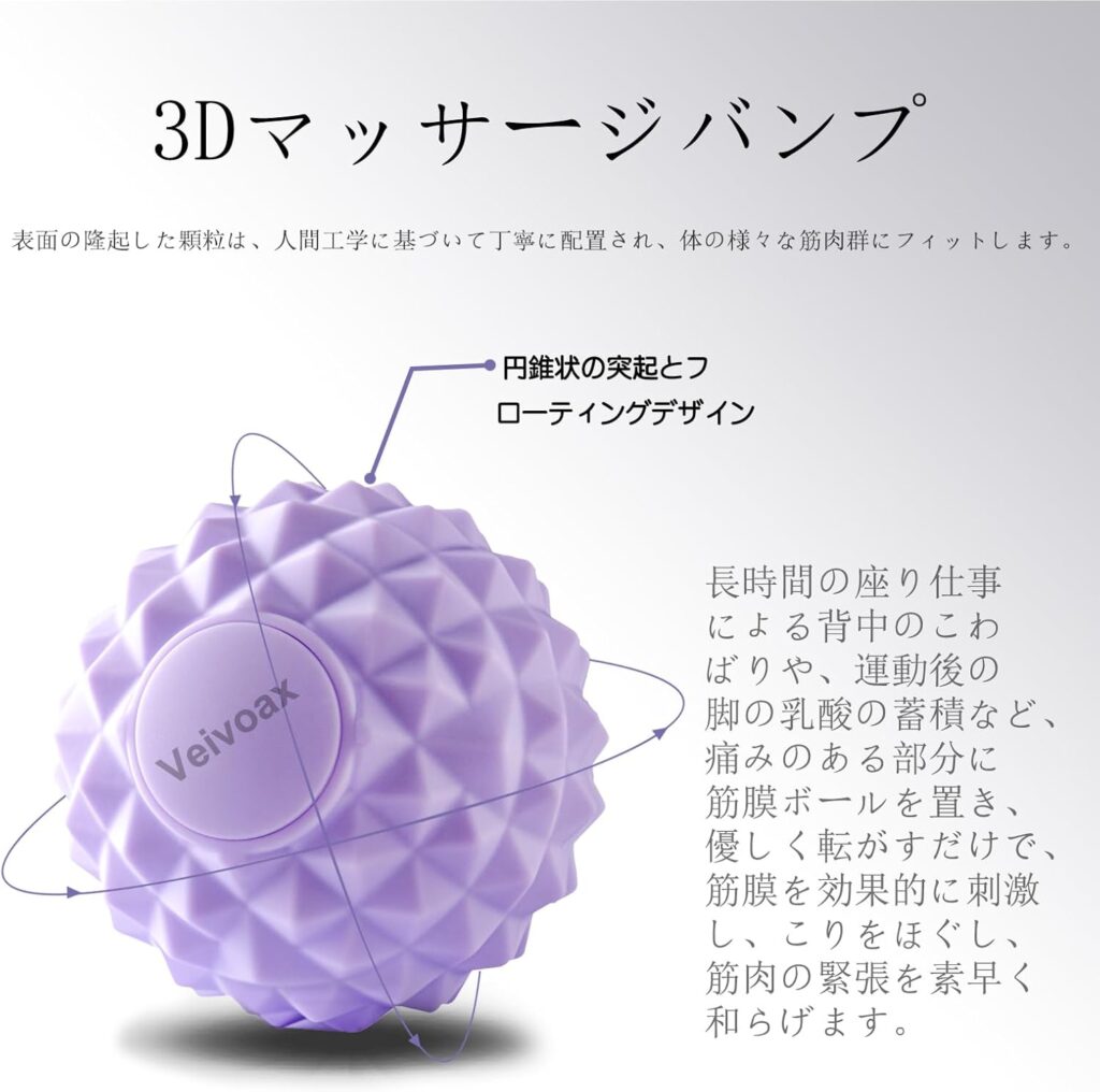 多くのメーカーが採用しているサイズです。これはテニスボールとほぼ同じ大きさで、肩甲骨の内側や足裏など、細かいポイントに入り込むのには適しています。しかし、お尻(大臀筋)や太ももなどの大きな筋肉に対しては、ボールが小さすぎて筋肉の厚みに埋もれてしまい、十分な刺激が深部まで届かないことがあります。 - Veivoax(8.5cm):