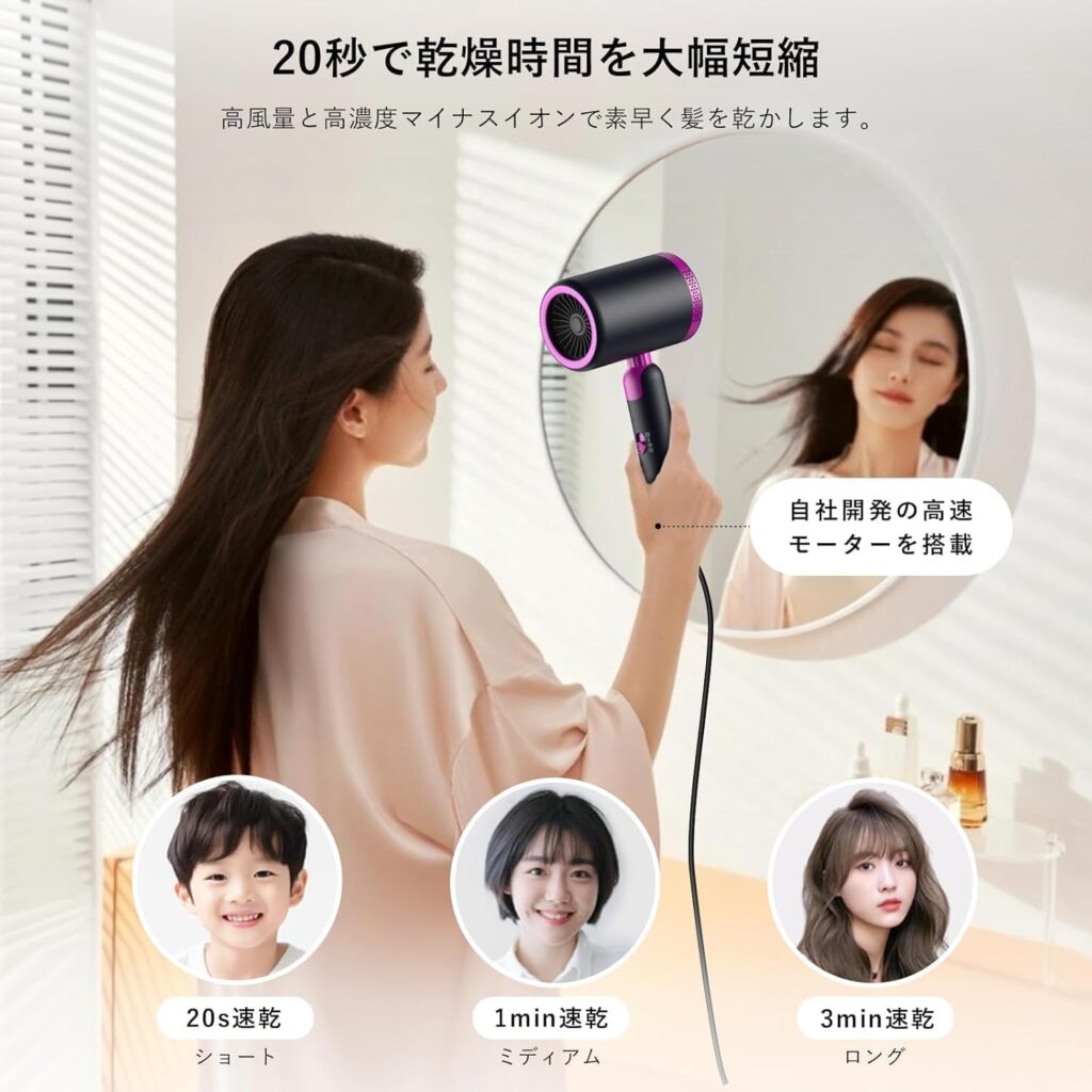 「独自開発高速モーターによる20秒速乾」という時短設計と「マイナスイオン2億個」が担う同時美髪ケア