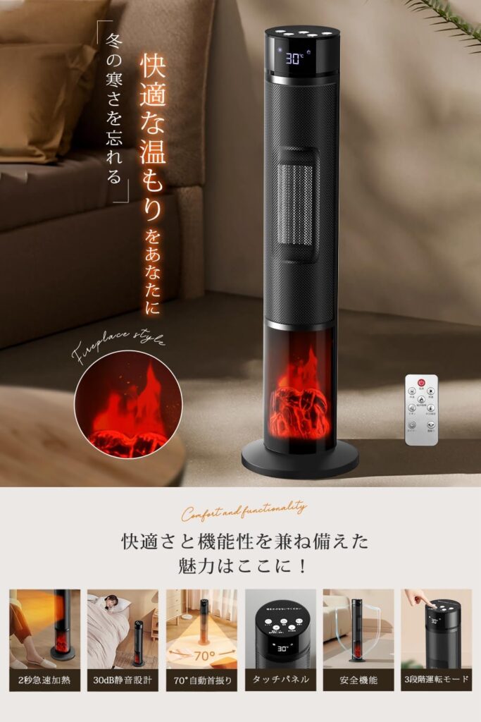 この商品の最大の魅力は、その圧倒的な「速暖性」と「コンパクトさ」に集約されます。セラミックヒーターの特性を最大限に活かし、スイッチオンからわずか数秒で温風を吹き出す能力は、冬の朝の冷え切った部屋や、暖房の届きにくい脱衣所などで絶大な効果を発揮します 。また、幅わずか6cm、高さ18cmという驚異的なスリムさは、デスクの下や部屋の隅など、これまでデッドスペースだった場所を有効な暖房スポットに変えてくれます。約2.76kgという軽量設計も手伝って、女性でも楽に家中を持ち運べる手軽さは、まるで「持ち歩ける暖炉」のようです。複雑な機能を削ぎ落としたシンプルな操作性も、直感的に使いたいユーザーにとっては大きなメリットと言えるでしょう。
