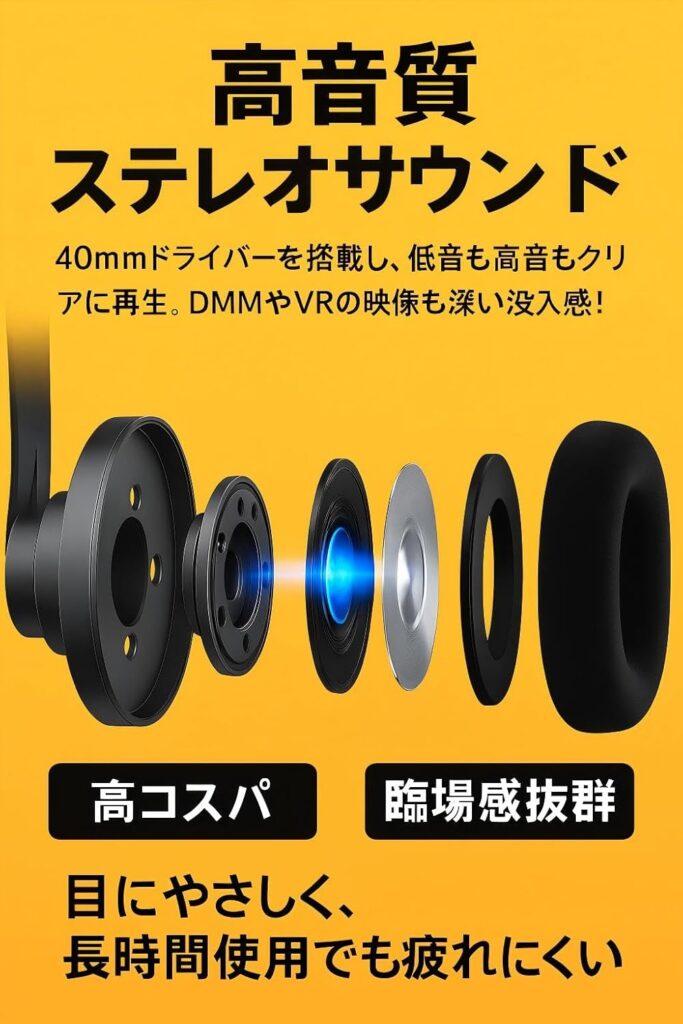 また、音響面でも違いが顕著です。国内の低価格帯モデルは、音をスマホのスピーカーに頼る「ヘッドホンなし」のタイプが主流ですが、VR SHINECONは一体型の着脱式ヘッドホンを標準装備しています。映画鑑賞やライブ視聴において、耳が密閉されることによる没入感の差は歴然としており、より深い世界へ入り込みたいのであればVR SHINECONに軍配が上がります。