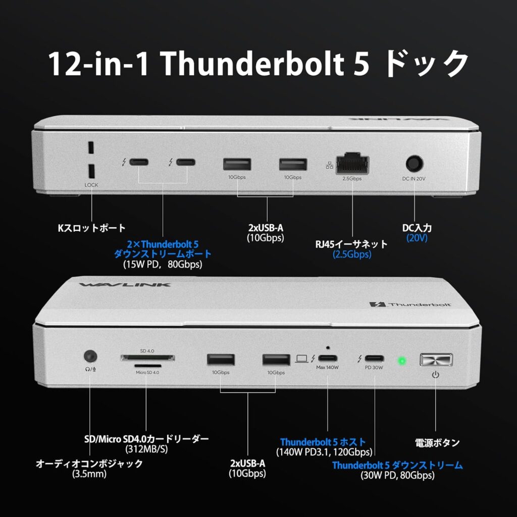Thunderbolt 5対応・最大120Gbps・140W給電・12ポートという仕様は、2026年現在の市場において最高水準のドッキングステーションスペックです。