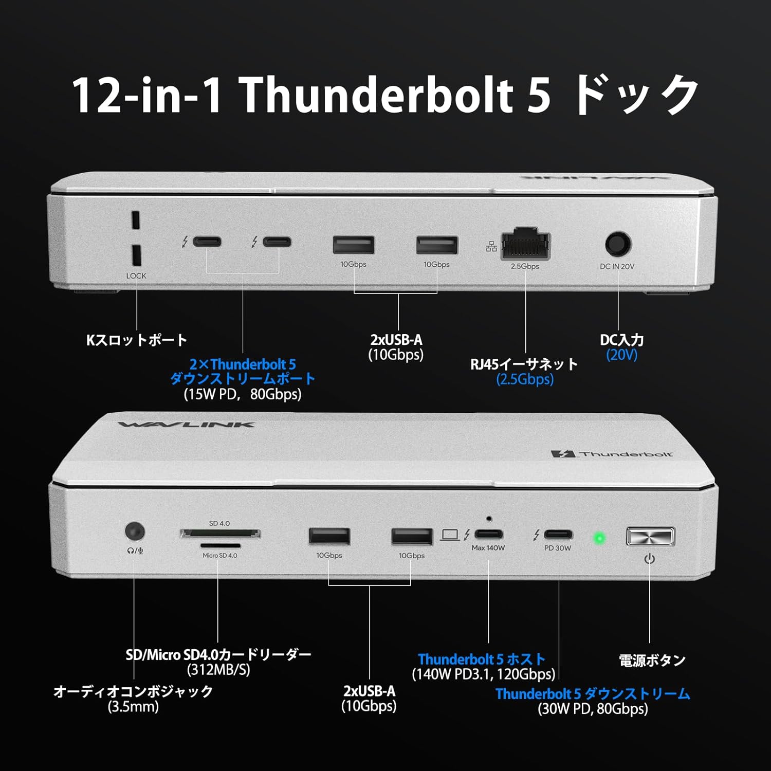 基本仕様: 12-in-1 Thunderbolt 5対応ドッキングステーション。
