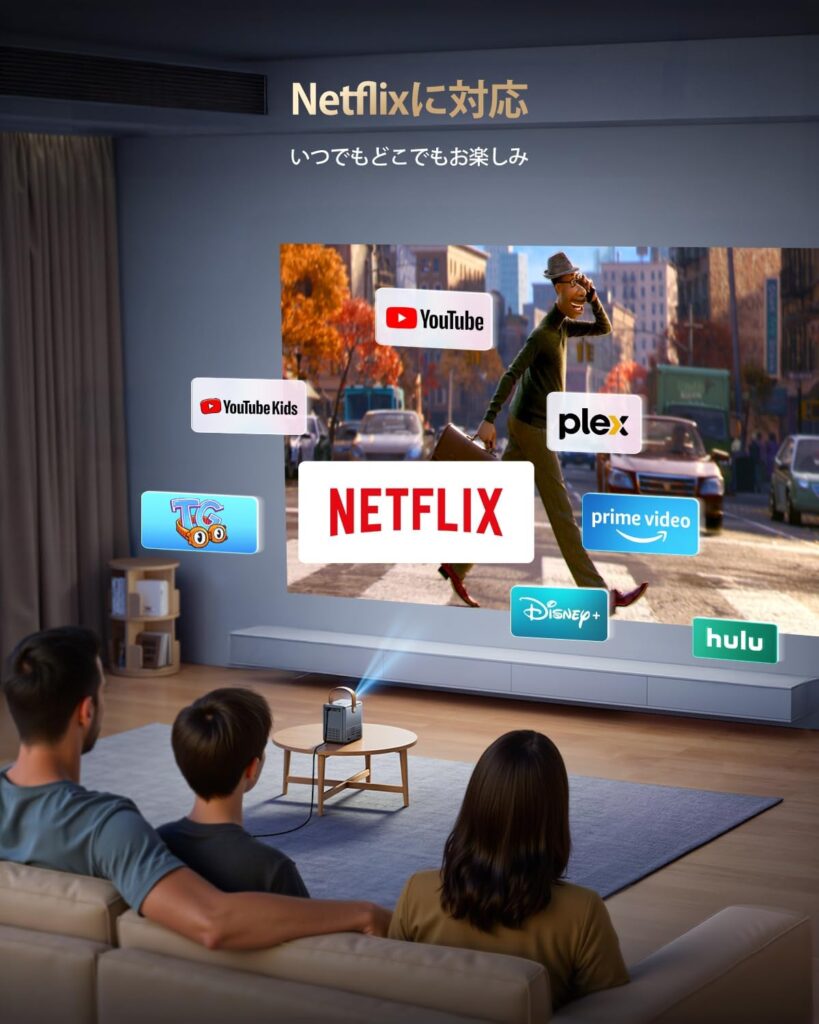 まず、OSが内蔵されており、YouTubeやNetflixなどの主要ストリーミングアプリが単体で動作します。これは、従来の「プロジェクター+PC」や「プロジェクター+ストリーミング端末」という複雑な構成を過去のものにします。Wi-Fi環境さえあれば、電源ケーブル一本をつなぐだけで、そこが即座にシアタールームへと変わります。