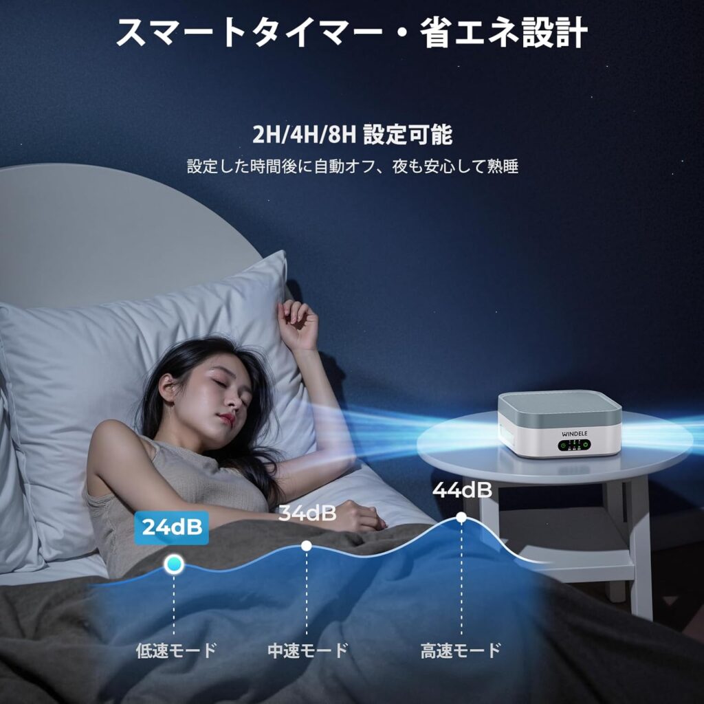 「夜寝るときに使っても、動いているのかわからないくらい静かです。$\text{24}$デシベルというスペックは嘘じゃなかったと感じています。」