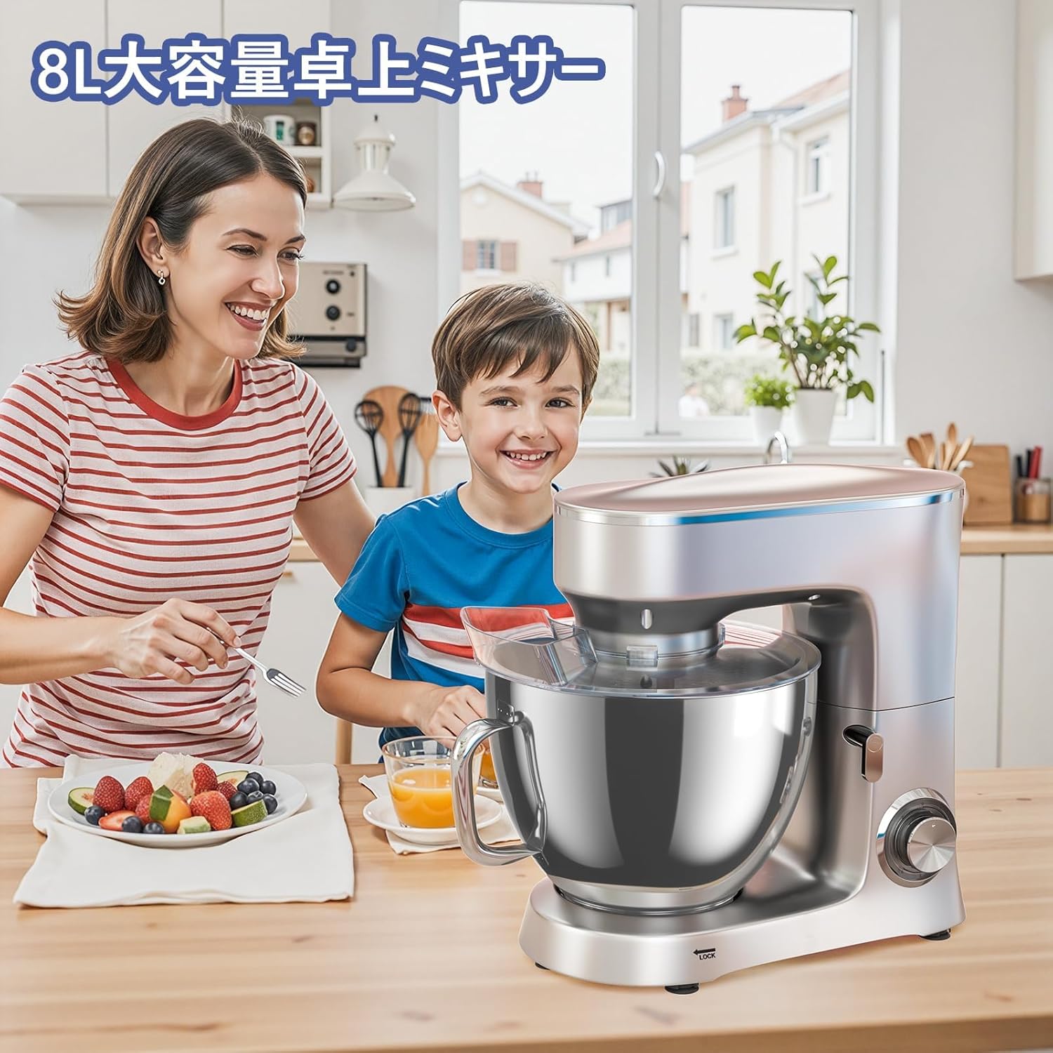 この商品の最大の魅力は、なんといっても「家庭用の常識を覆す8リットルという巨大な容量」にあります。一般的な家庭用スタンドミキサーが4〜5リットル前後であるのに対し、WY019はその倍近い容量を持っています。これは、一度に大量のパン生地やクッキー生地を仕込みたい「作り置き派」や、大家族、あるいは小さなカフェを営むセミプロ層にとって、喉から手が出るほど欲しいスペックです。