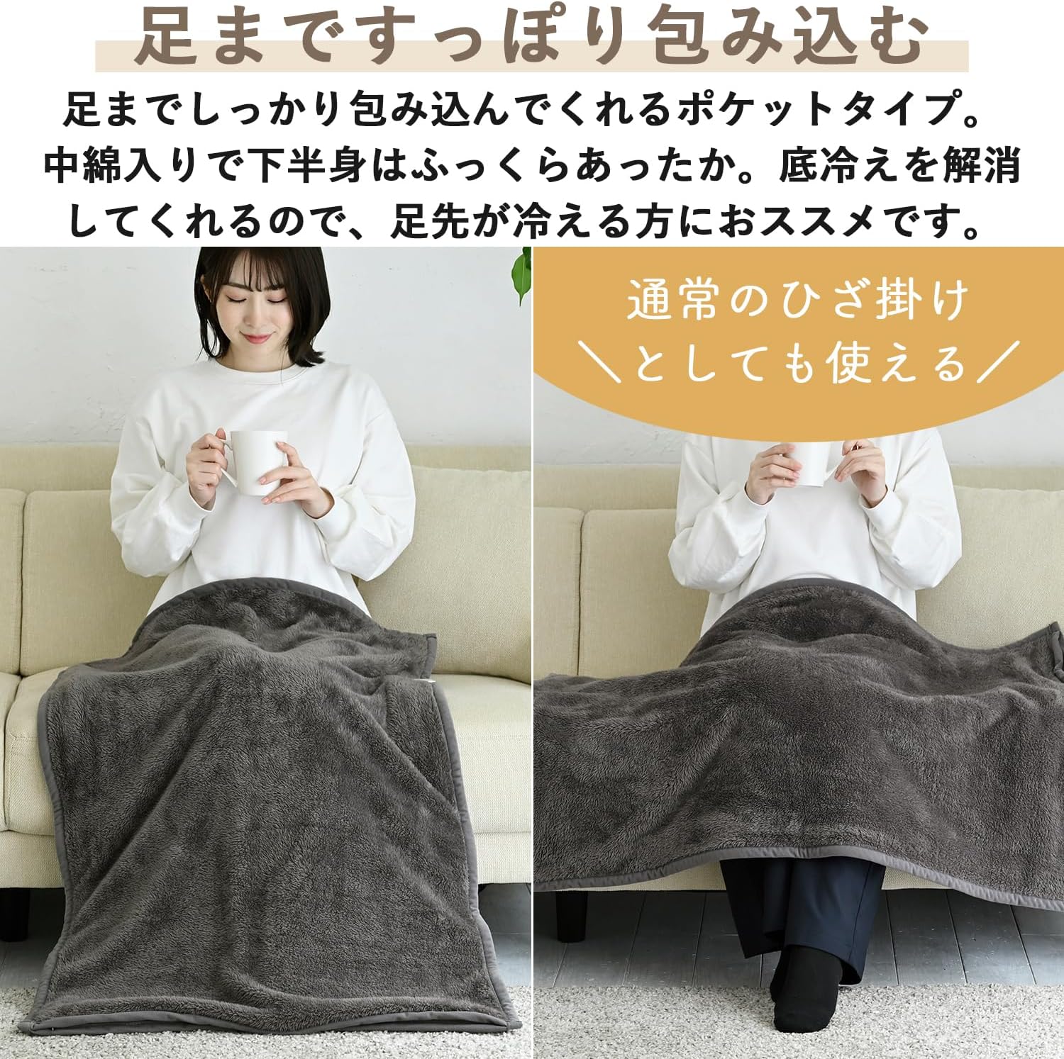 「足を入れるスタイルのため、寝転がって全身を覆うような使い方には向いていません。」