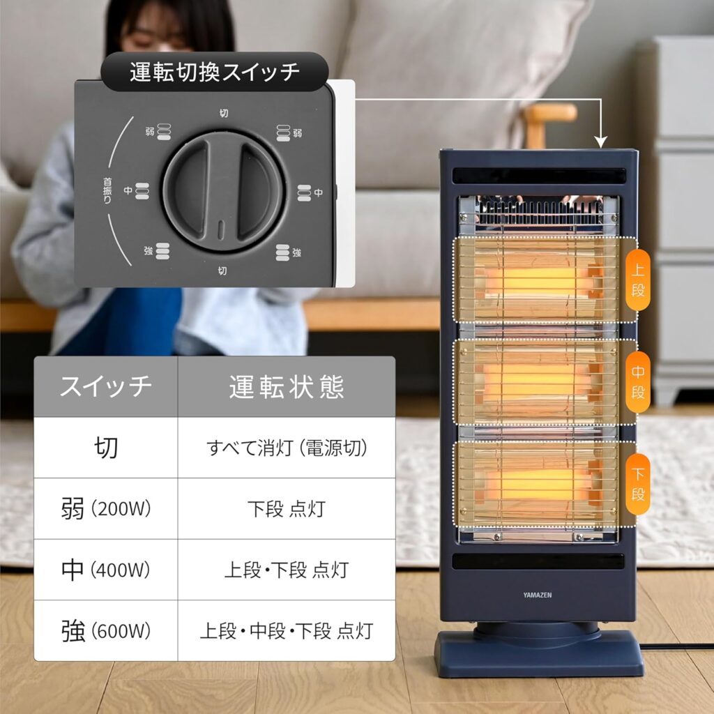 「3段階で細かくパワーを調整できるのが便利です。少し肌寒い時は弱、本当に寒い時は強と、電気代を気にしながら使い分けられます。」