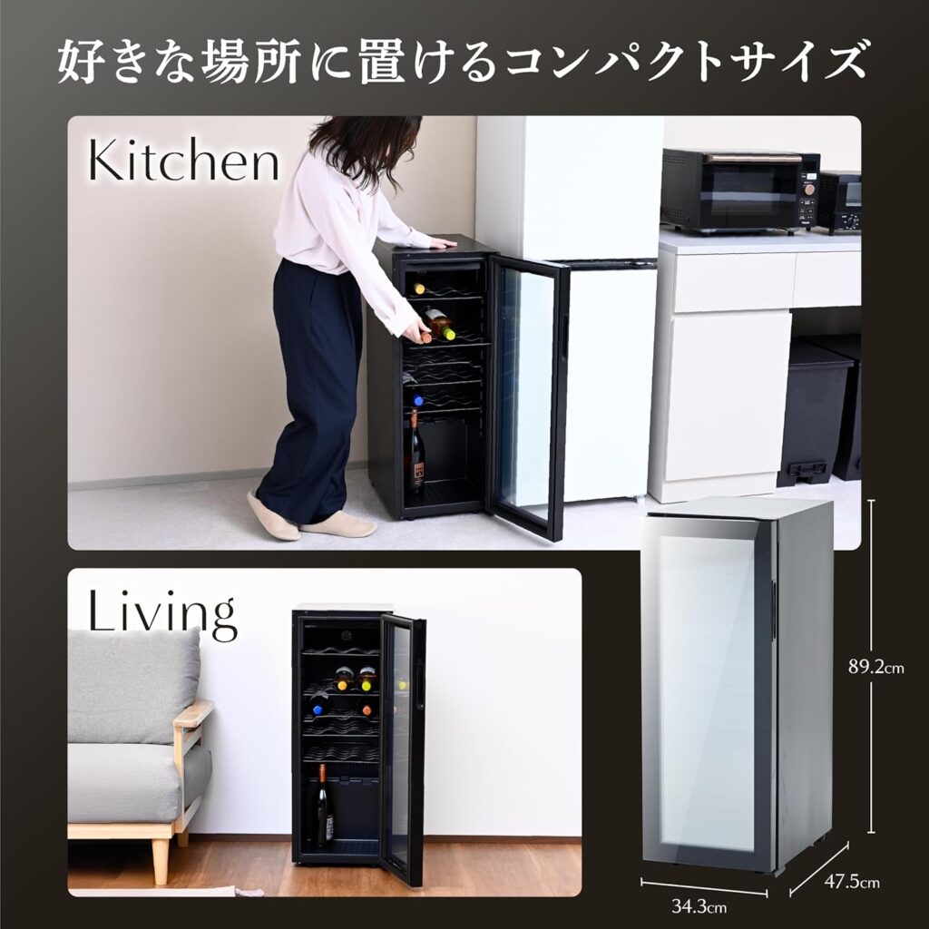 また、棚の配置が絶妙で、日本酒の四合瓶やシャンパンなど、標準的なボルドーボトル以外の収納にも柔軟に対応できる点が秀逸です。デザインも無駄を省いた漆黒のマット仕上げで、どんなインテリアにも馴染みます。まさに、これからコレクションを増やしていきたいワイン初級者から中級者にとって、最も失敗の少ない選択肢と言えるでしょう。