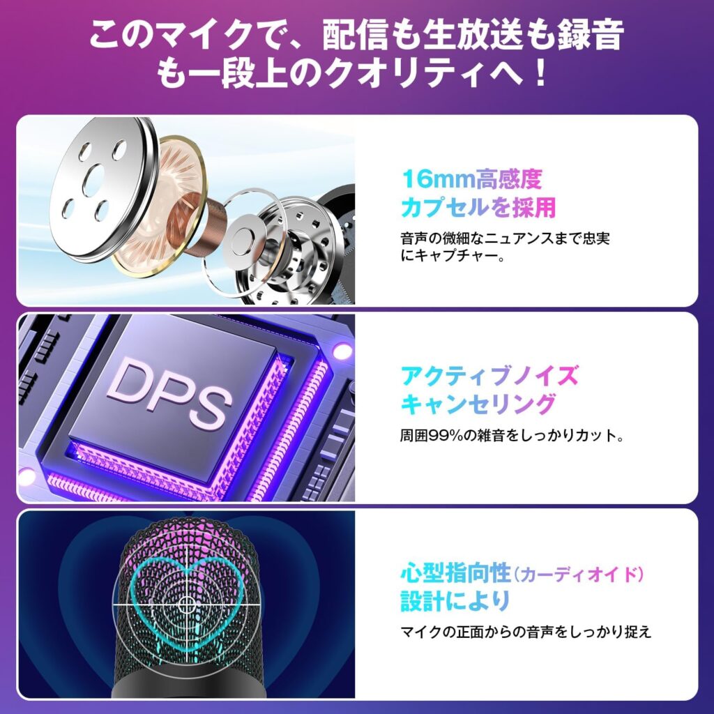 このマイクの最大の武器は、「全部入り」の贅沢さにあります。通常、低価格帯のマイクでは省略されがちな「エコー機能」や「物理ミュートボタン」、「ノイズリダクション」といった配信者が欲しがる機能が、これでもかと詰め込まれています。特にS/N比85dBという数値は、背景ノイズの少なさを示しており、静寂の中で声だけを浮き上がらせるようなクリアな収音を期待させます。また、接続がUSB Type-Cである点も現代的で評価できます。古いMicro-USB端子を採用している廉価品も多い中、最新のデバイスとの親和性を確保している点は、ユーザーの利便性を第一に考えた設計と言えるでしょう。