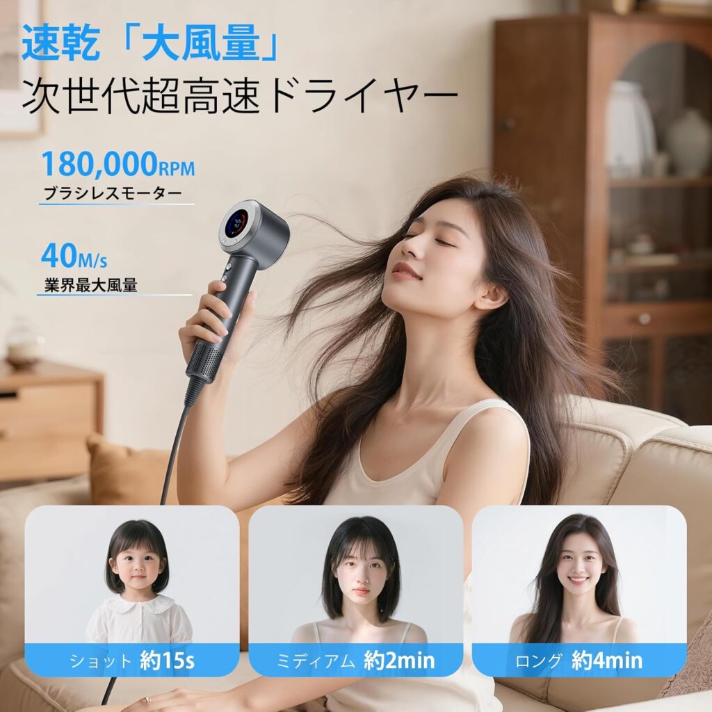 「風量が驚くほど強く、腰まであるロングヘアがこれまでの半分の時間で乾き終わります」