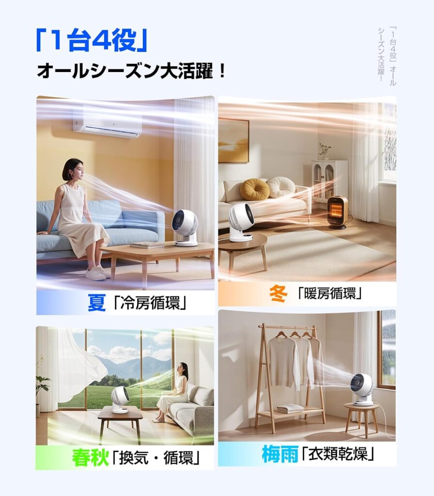 YONAのサーキュレーターは、高さ31.5cmという絶妙なサイズ感であり、無印良品の小型モデルよりも高機能(首振りやタイマー付き)でありながら、大型モデルよりも設置場所を選ばないという「ちょうどいい中間地点」に位置しています。特にキッチンやデスクの上といった「テーブルトップ」での使用を想定した場合、YONAのポータブル性が際立ちます。