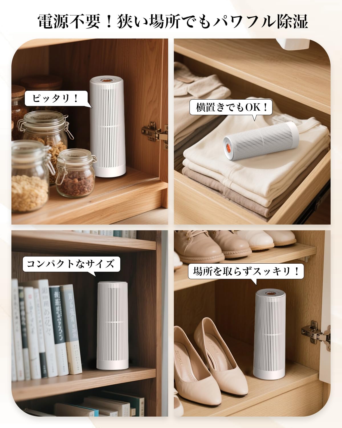 「下駄箱の湿気取りとして導入しましたが、電源コードがないのでどこにでも置けるのが本当に便利です。」