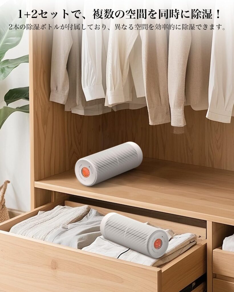 また、特筆すべきは「1+2」というパッケージ構成です。通常、この手の製品は乾燥中に除湿がストップするのが弱点ですが、ボトルが2本付属することで、「1本は除湿、1本は乾燥」というシームレスな運用が可能になります。さらに、保証期間が条件付きで最大2年まで延長される点は、製品の耐久性に対するメーカーの自信の表れであり、ユーザーにとって大きな安心材料となります。