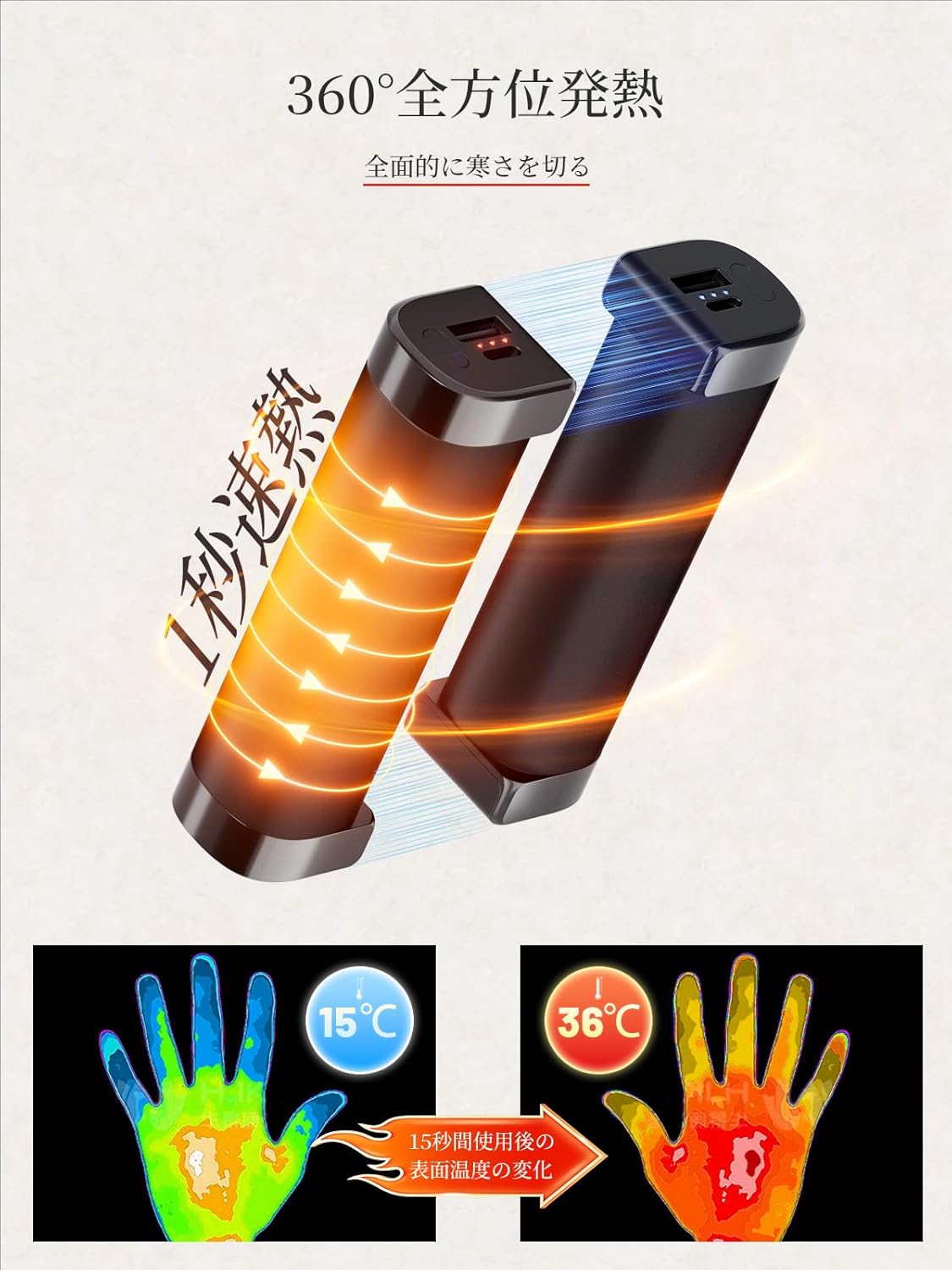また、材質に採用されている合金素材は熱伝導率が極めて高く、スイッチを入れた瞬間に熱が広がるため、凍えるような指先を即座に救ってくれます。表面のABS樹脂は耐熱性と耐久性に優れており、毎日ハードに使用しても傷がつきにくい仕様です。さらに、ブラックを基調としたミニマルな外観は、ビジネスシーンからアウトドアまでどんなファッションにも違和感なく馴染みます。これ一台で「冬の寒さ」と「スマホの電池切れ」という二大ストレスから解放される点は、現代人にとって非常に価値の高いポイントです。