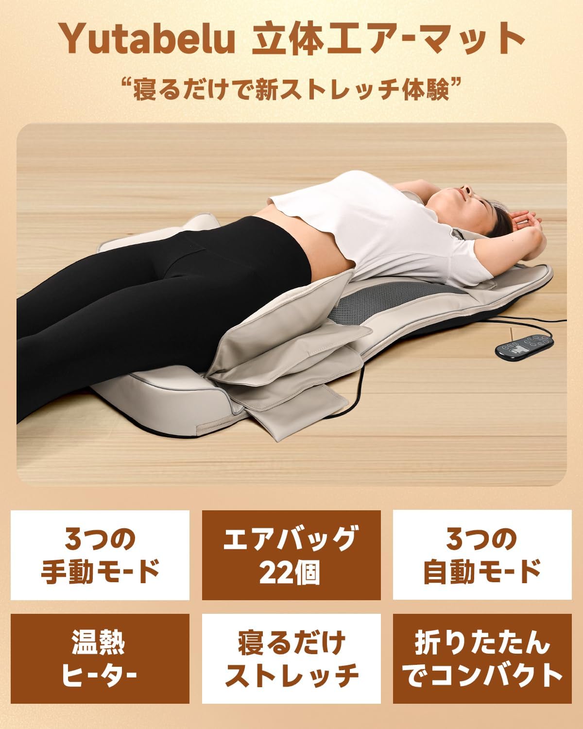 Yutabelu(ユタベル)は、知名度こそ大手メーカーに劣りますが、ネット通販を中心に賢い消費者の支持を集めるコストパフォーマンスに優れたブランドでした。「立体エアーマット YU-001W」は、22個のエアバッグによる強力なストレッチ機能と、手入れのしやすいレザー素材、安心のタイマー機能を備え、日々の疲れを癒やす頼もしい相棒となり得ます。