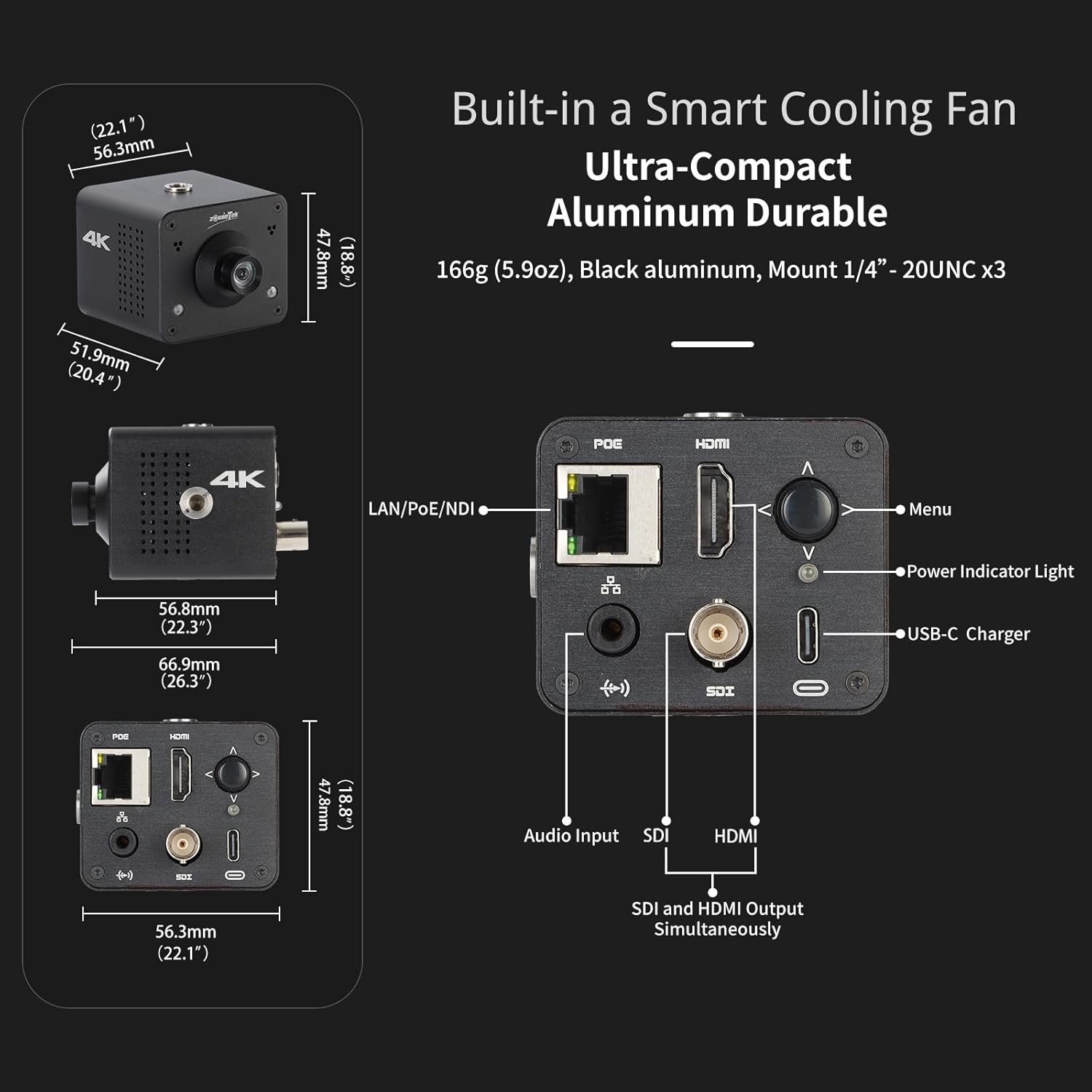 - 付属品: 4K POV カメラ、4K 8MP M12 レンズ、CS – M12 アダプター、CS – C アダプター、クイック スタート ガイド、ホット シュー、USB Type-C ケーブル、USB Type-C 25W PD 充電器