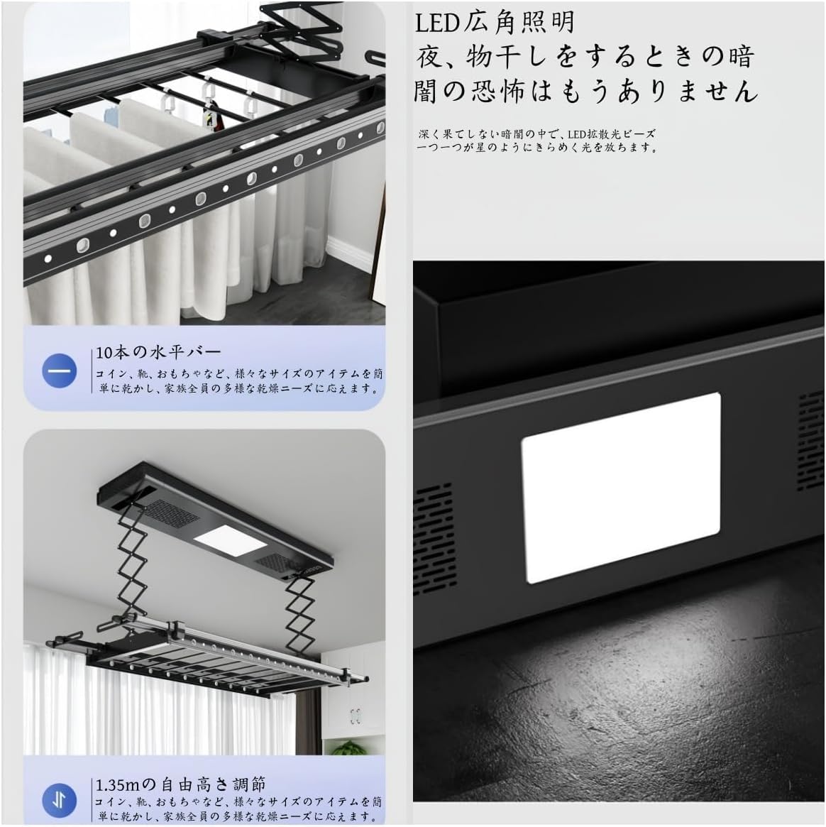 「照明がついているので、夜間に洗濯物を干す際も手元が明るく、別のライトをつける手間が省けます。」